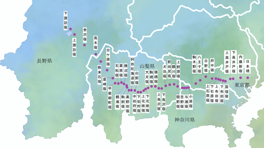 日本橋を出発すると、皇居をぐるっと回って半蔵門へ辿り着くとそこから西へ。新宿⇒調布⇒府中⇒八王子(ここまで東京)、小仏峠を超えて相模湖(この部分だけ神奈川)を過ぎると、渋滞で有名な上野原⇒猿橋を経て最大難所笹子峠超え。その後はワインの勝沼⇒温泉の石和と下りに下って甲府にやってきます。ここまでが表街道と呼ばれます。引き続きの裏街道は、韮崎⇒小淵沢(ここまで山梨県)と八ヶ岳高原に向けて標高を上げて、茅野⇒諏訪(ここまで長野県)とやってきて、下諏訪は諏訪大社の下社を過ぎたところで中山道と合流してゴールインとなります。